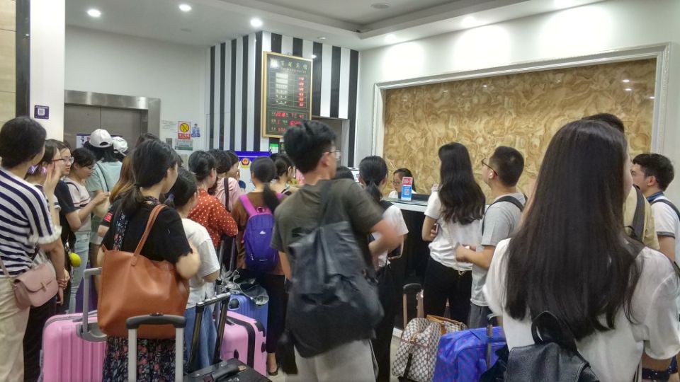 经过三小时的车程,实训团一路奔波,历经风雨终于在16时许顺利抵达实训地附近的宾馆。同学们在实训主办方杨学林老师的带领下井然有序的办理了入住手续。