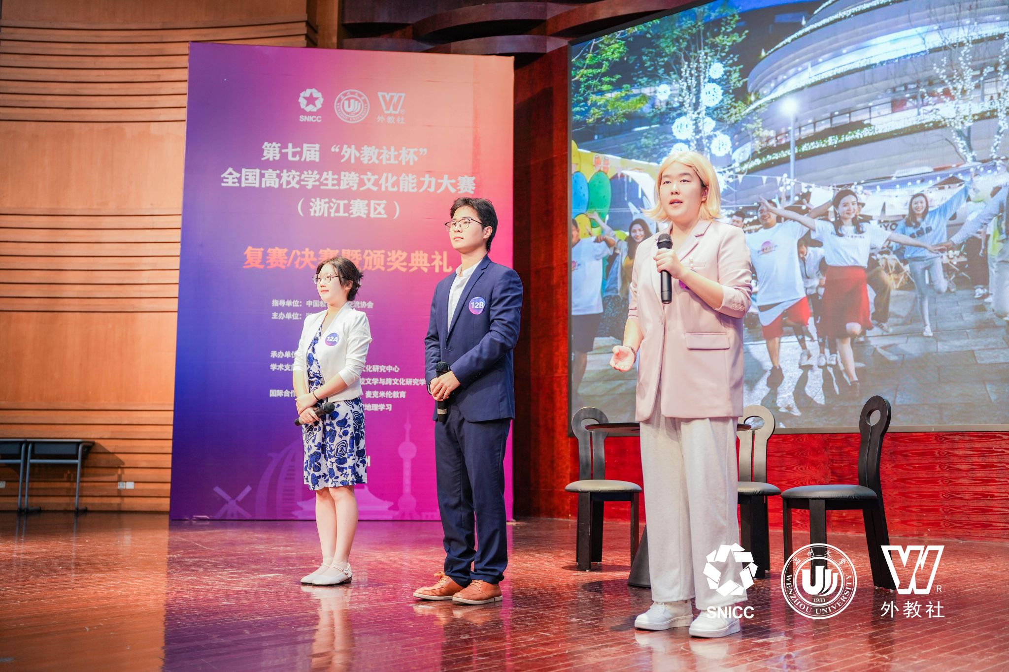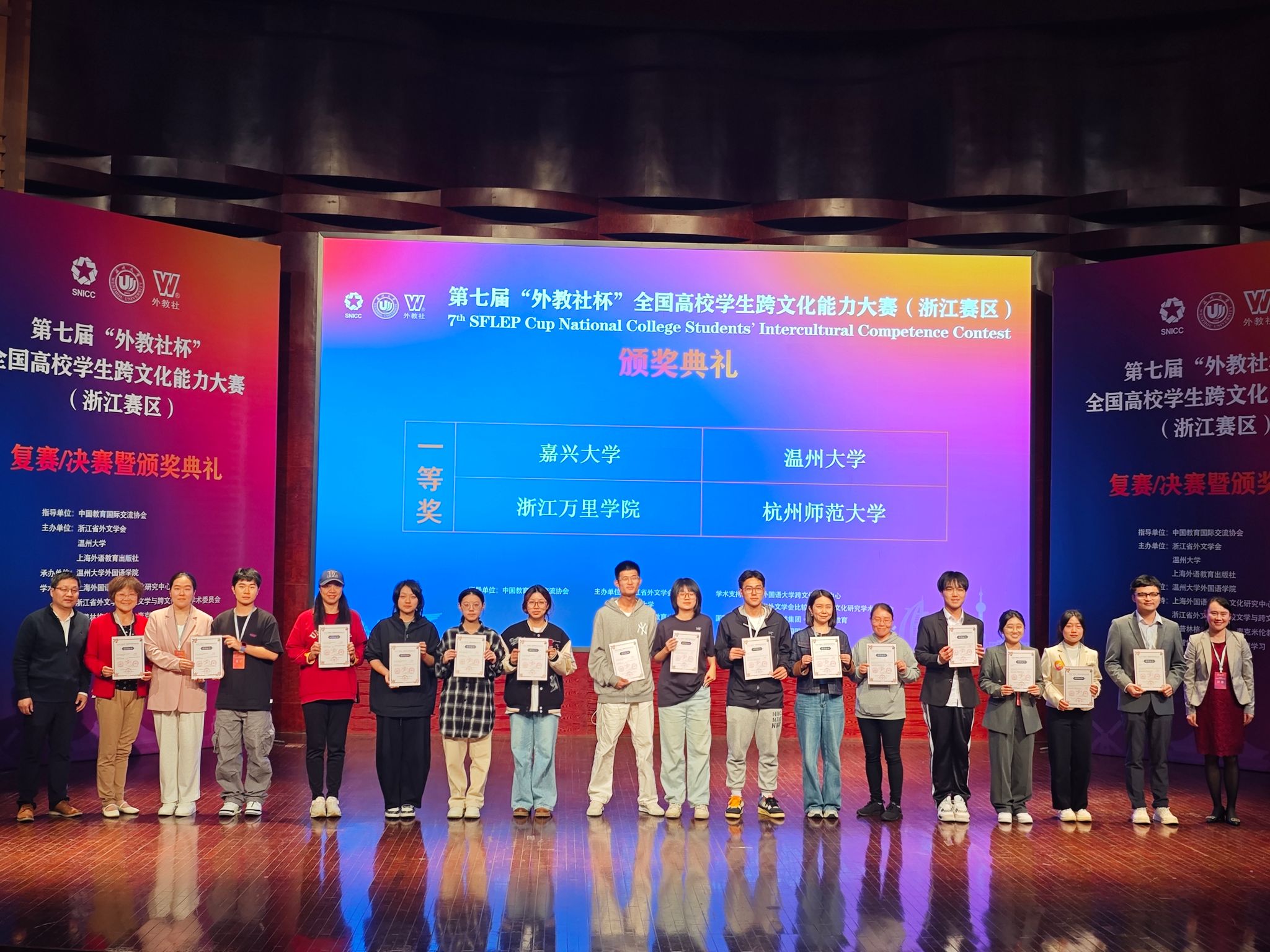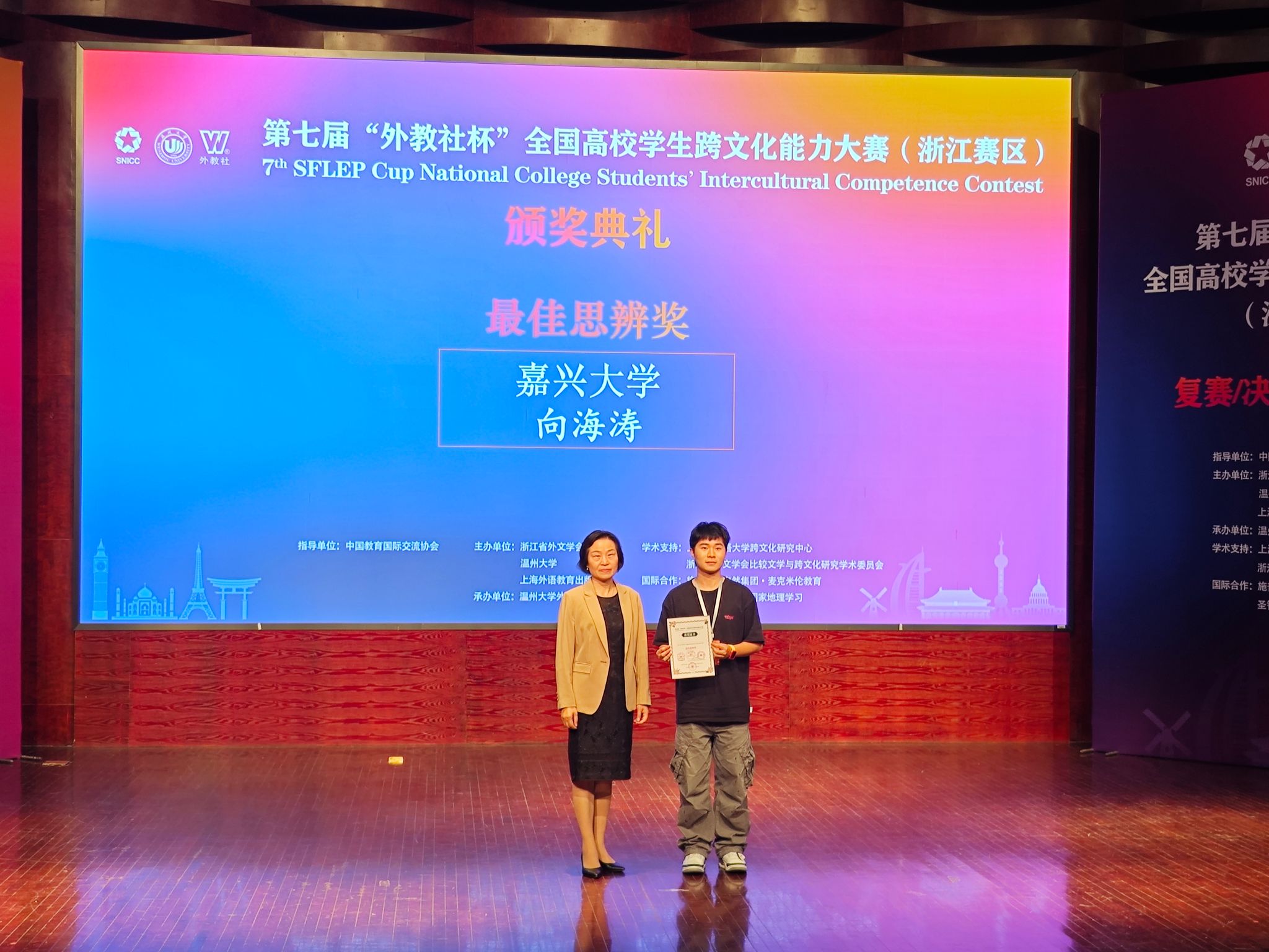11月16日至17日,第七届“外教社杯”全国高校学生跨文化能力大赛浙江赛区(英文组赛道)在温州大学成功举办,吸引了来自浙江省30所高校的代表队参加。由外国语学院陶丹玉、罗国华和鲁俊丰老师指导的学生向海涛、项夕雅和周子璇三位选手代表嘉兴大学参赛获得省级一等奖,其中向海涛同学获得“最佳思辨奖”。这是我校学生在该项赛事获奖上取得的新突破。