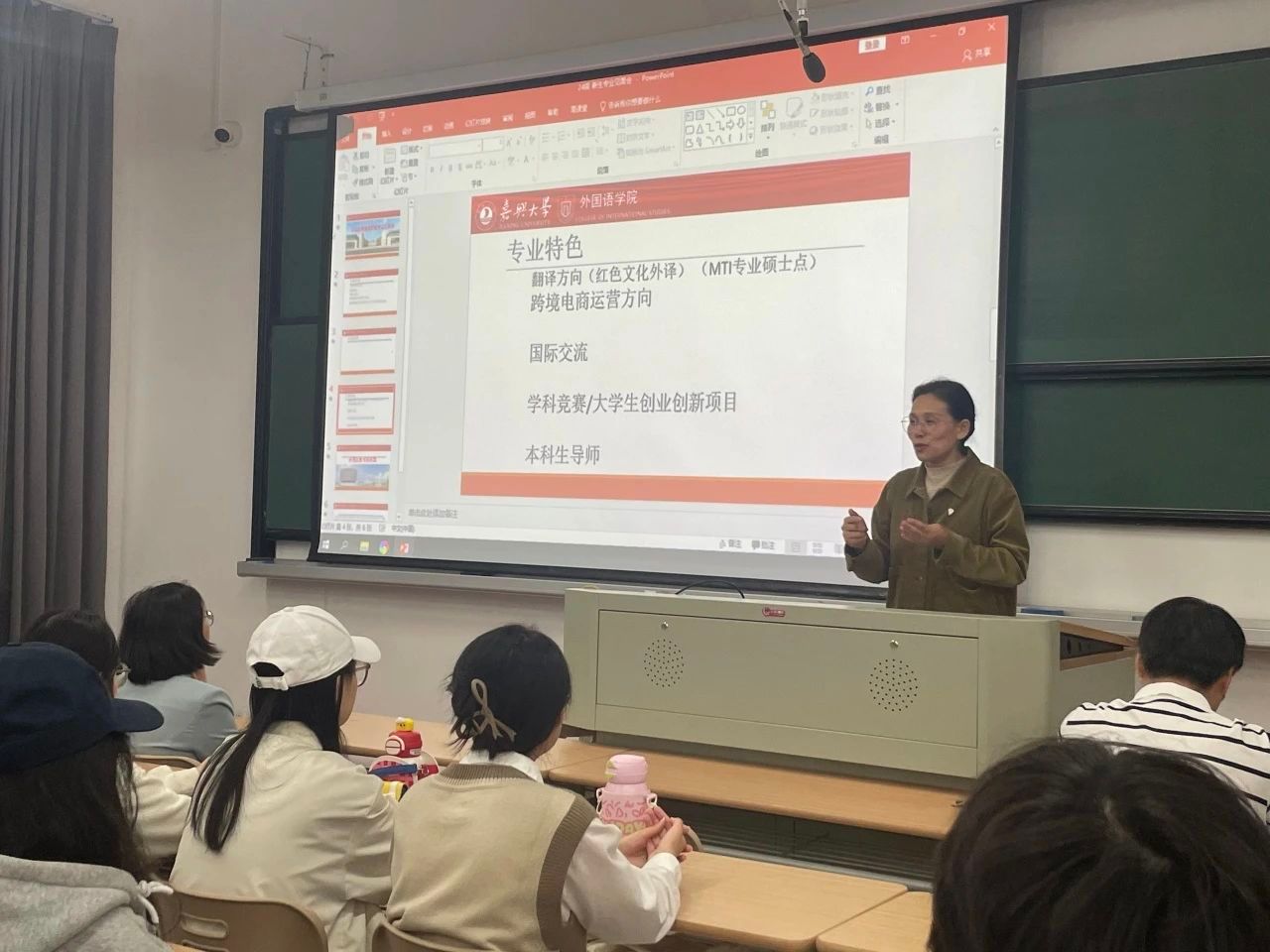 随后,鲁俊丰细致讲解了大学英语四六级及英语专业四八级等考试的情况,建议新生们从大一起就确立明确的奋斗目标。陈丽向学生们介绍了外院外籍教师的整体情况和学校的外语角活动,鼓励他们走出自己的舒适区,勇敢创造机会练习英语口语。杨迎春从兴趣培养、技巧运用、听力水平提升计划等方面着手,手把手教授学生们如何循序渐进提升听力水平。