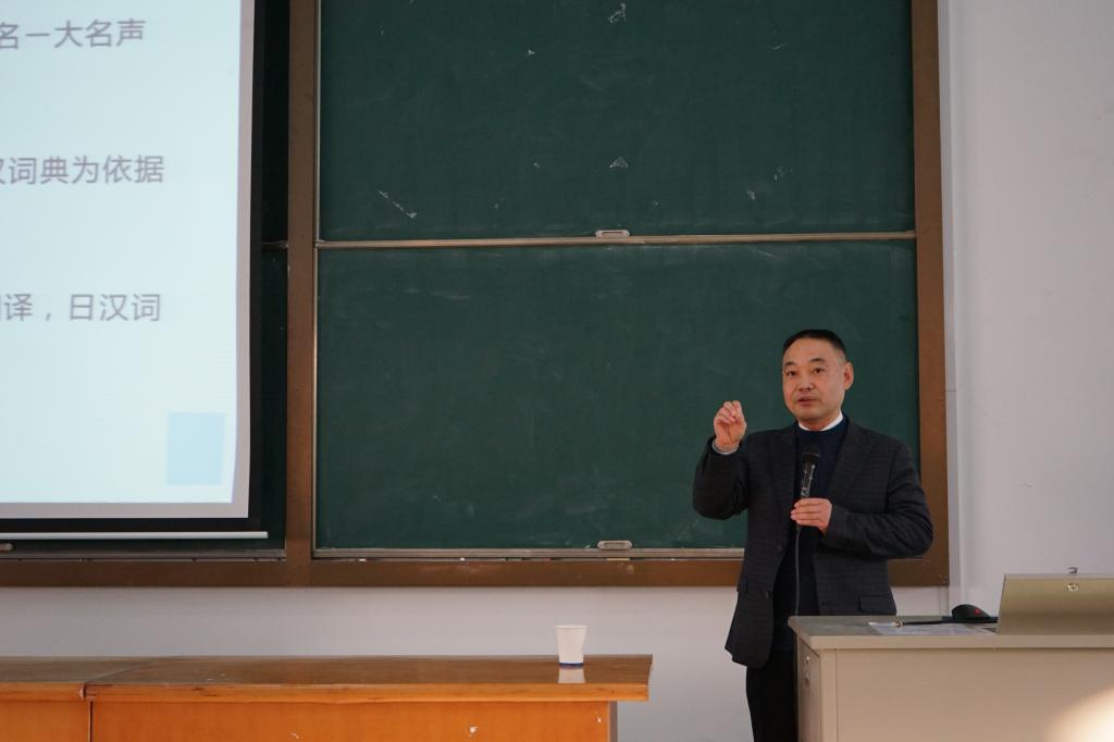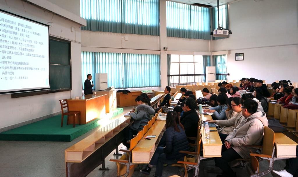 2019年12月12日下午,上海外国语大学施建军教授莅临我院,在外语楼310做了一场题为“关于中日近义词的互译性问题”的学术讲座。讲座由外国语学院副院长郭永恩教授主持,日语系全体教师和数名英语系教师以及百余名日语专业学生积极参加了讲座。