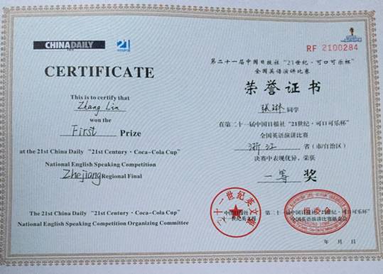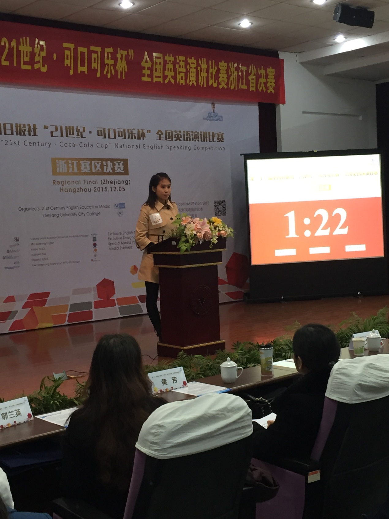 第21届中国日报社“21世纪·可口可乐杯”全国英语演讲比赛浙江省决赛于12月5日在浙江大学城市学院举行,来自全省各个高校的36名选手参与角逐。嘉兴学院派出外国语学院英语122班张琳同学参赛,她在大赛中表现优秀,从众多参赛选手中脱颖而出,获得一等奖的佳绩!