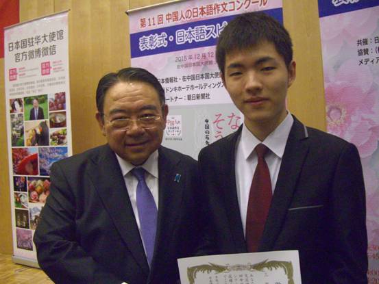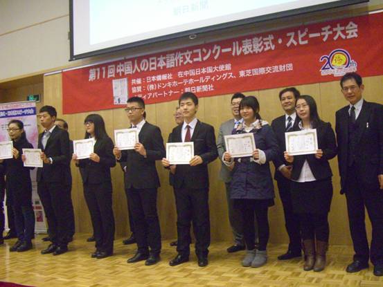 12月12日下午,日本外务省、日本国驻华大使馆、中国日本商会支持,东芝国际交流财团、朝日开元kaiyuan(中国)社赞助、“日中交流研究所”及《日本侨报社》主办的第11届“中国人日语作文大赛”颁奖仪式在北京日本驻中国大使馆举行。嘉兴学院日语131班牛宝伦同学的作文《日中青年交流について――私達の現状を理解してほしい!障害を乗り越えて仲良く交流しよう》荣获三等奖,日语121戴蓓蓓、日语122方啸・朱杭珈、日语131陈子轩・霍思静等5名同学获得佳作奖。日籍教师照屋庆子荣获优秀指导教师称号。