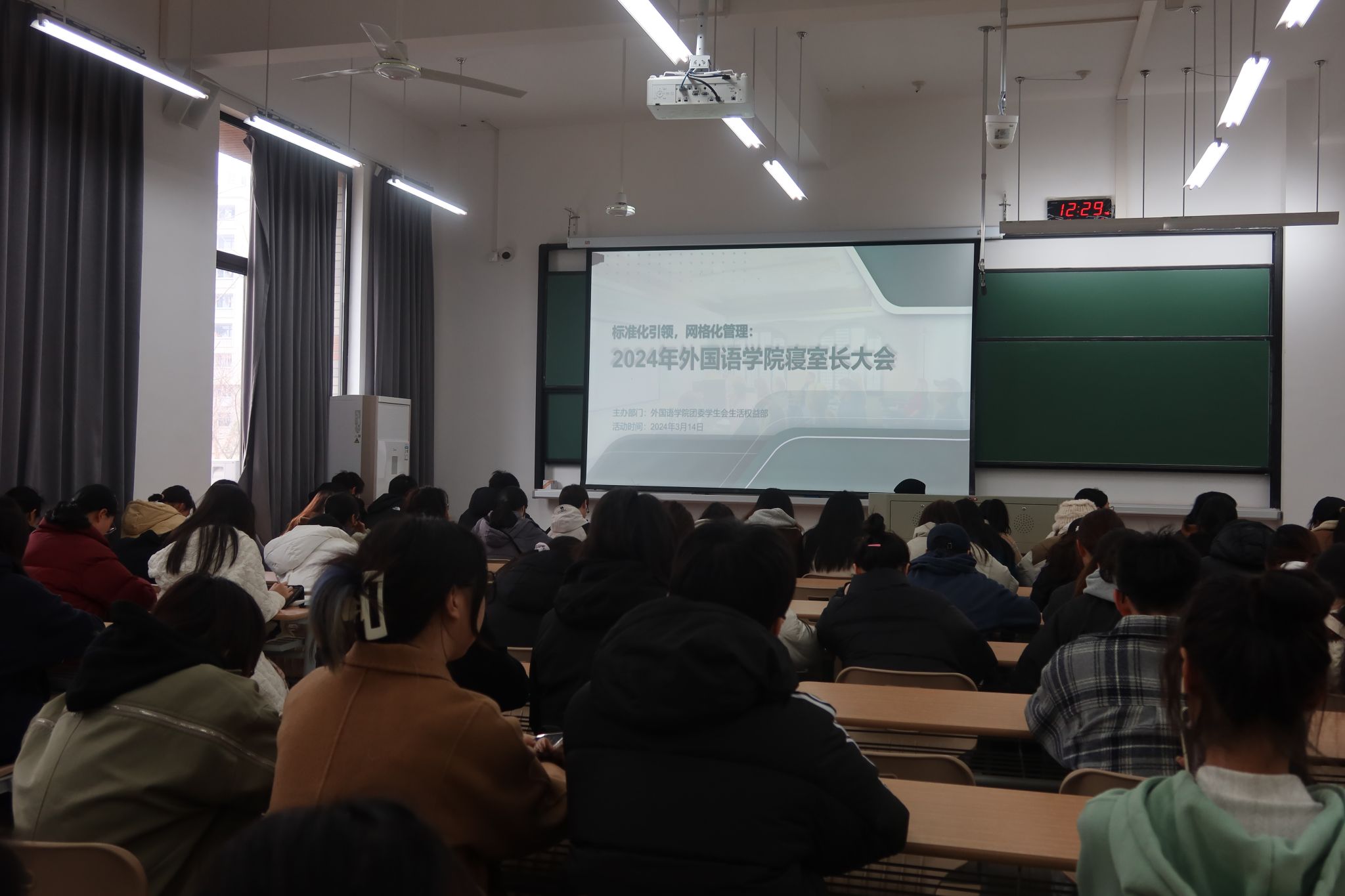 3月14日中午,外国语学院在兴德南楼126教室召开2024年外国语学院寝室长大会。本次会议旨在提升宿舍管理水平、增强学生自治能力,共同探讨宿舍文化建设、安全卫生管理等关键议题。