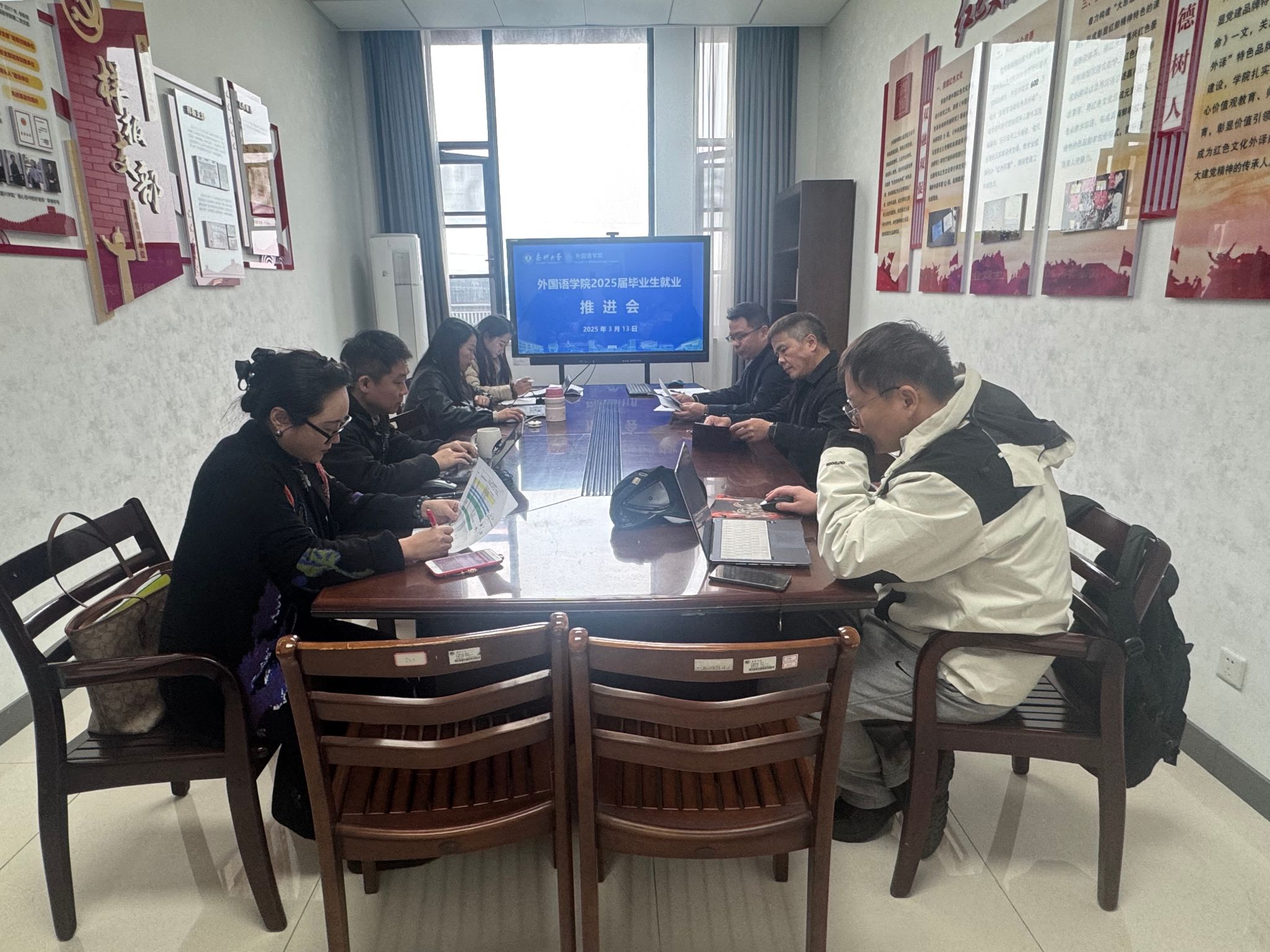 3月13日,外国语学院在兴德楼南楼521会议室召开2025届毕业生就业工作推进会。学院院长唐艳芳、党委副书记张啸峰、全体辅导员及毕业班班主任共同参会,围绕就业形势分析、任务部署与协同机制展开深入研讨。