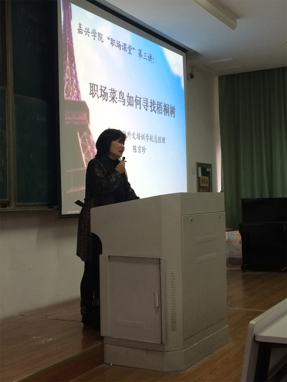 11月27日下午3:30分,由外国语学院承办的嘉兴学院“职场课堂”第三讲在教二A225举行。此次“职场课堂”邀请到了嘉兴市海锐外文培训学校总经理陈京珍主讲。