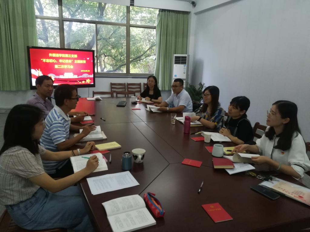 为深入贯彻习近平新时代中国特色社会主义思想、党的十九大精神,扎实推进“不忘初心、牢记使命”主题教育专题学习往深里走、往心里走、往实里走,9月29日下午,外国语学院教工第三支部在外语楼204室召开了第二次集中学习交流会。