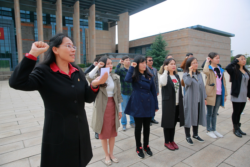10月17日上午,外国语学院党委组织师生党员来到南湖革命纪念馆,面向党旗重温入党誓词,以特别的方式迎接党的十九大召开。参加此次宣誓活动的有党委书记陶丹玉、院长唐艳芳、党委副书记周钰、外国语学院其他党委委员以及党员老师和部分党员学生。