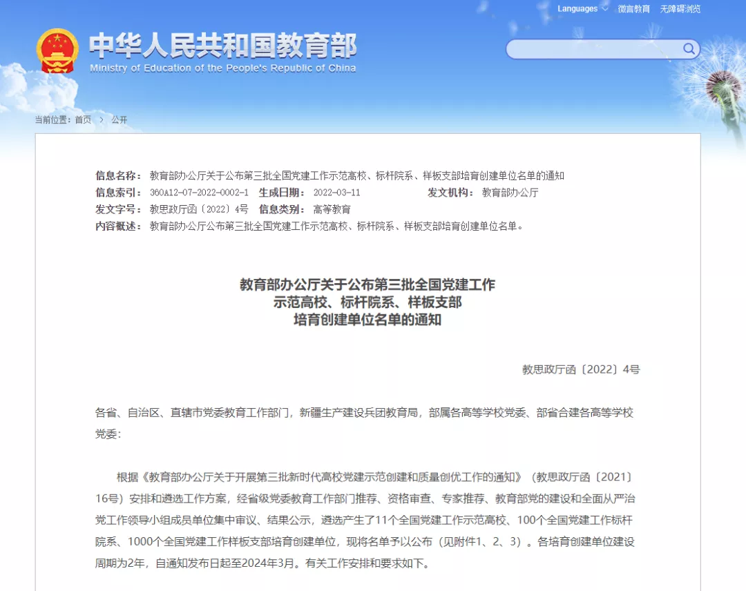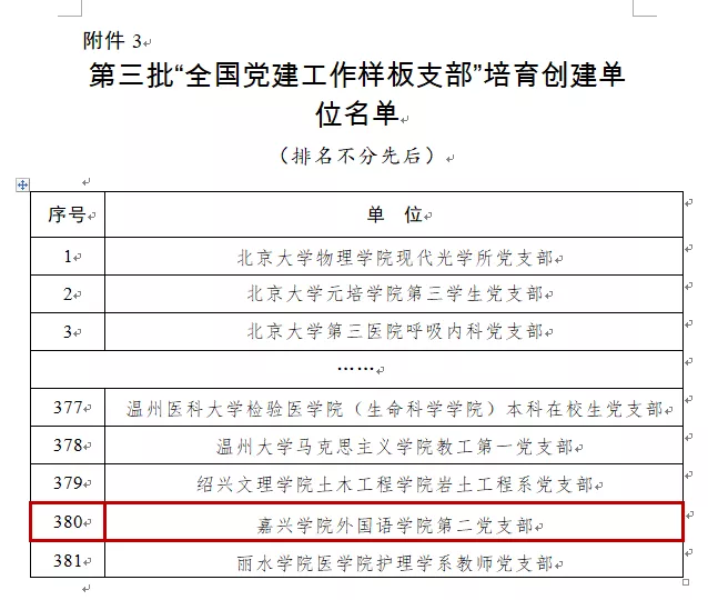 近日,教育部办公厅发文公布了第三批全国党建工作示范高校、标杆院系、样板支部培育创建单位名单。经省级党委教育工作部门推荐、资格审查、专家推荐、教育部党的建设和全面从严治党工作领导小组成员单位集中审议、结果公示,遴选产生了11个全国党建工作示范高校、100个全国党建工作标杆院系、1000个全国党建工作样板支部培育创建单位。外国语学院第二党支部入选第三批“全国党建工作样板支部”培育创建单位。