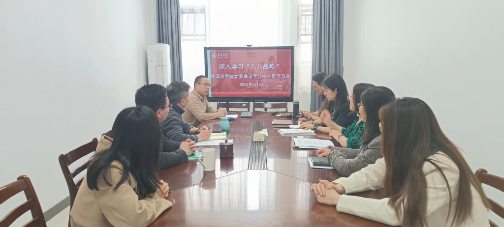 5月8日,外国语学院党委理论学习中心组举行“学习贯彻习近平新时代中国特色社会主义思想、忠实践行‘八八战略’”专题学习会。学院党委书记周钰和副院长喻锋平分别作主题发言,全体中层领导干部及党委委员参加学习会。