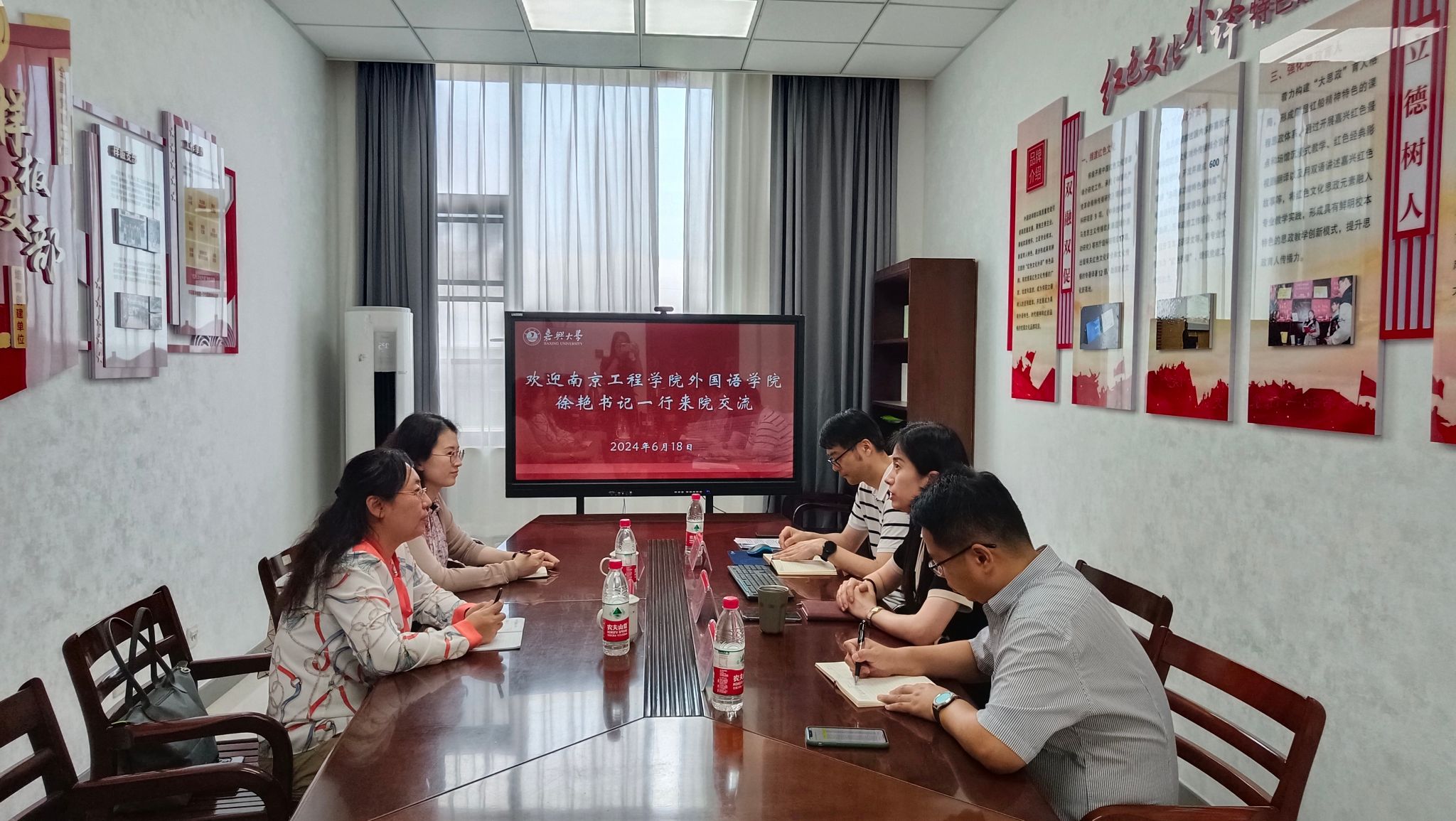 6月18日下午,南京工程学院外国语学院党总支书记徐艳、支部书记何慧文一行来学院交流党建工作。外国语学院党委书记周钰、党委副书记张啸峰以及第二党支部委员鲁俊丰参加交流会。