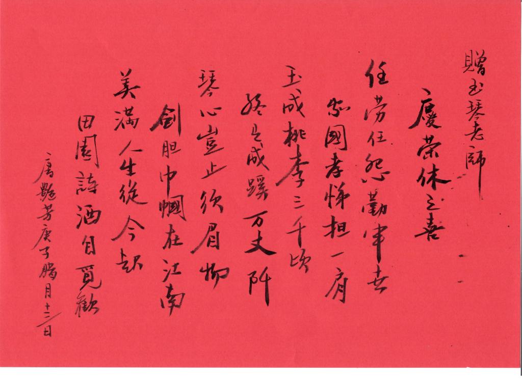 在大家的热烈而持久的掌声中,学院领导向任玉琴和陆珠希两位老师送上鲜花和纪念品,并向远在美国的张菊芬老师送上深深的祝福。唐艳芳院长即兴创作了三首藏头诗,作为欢送老师们的珍贵礼物,并由喻锋平副院长和郭永恩副院长挥毫泼墨、亲自赠上。