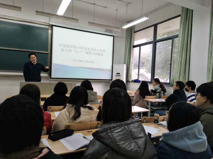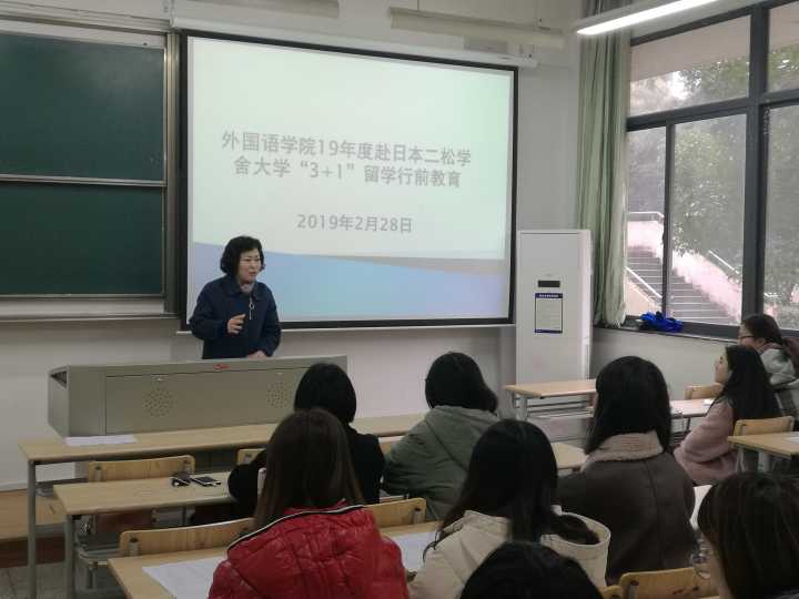 今年日语专业将有15名赴日本二松学舍大学“3+1”留学,这是我院派往日本二松学舍大学的第三批留学生。2月28日,外国语学院为15名同学举办了赴日前的教育讲座。郭永恩副院长、外事处李月顺副处长以及日语系刘韵超主任参加了本次讲座,讲座由刘韵超主任主持。