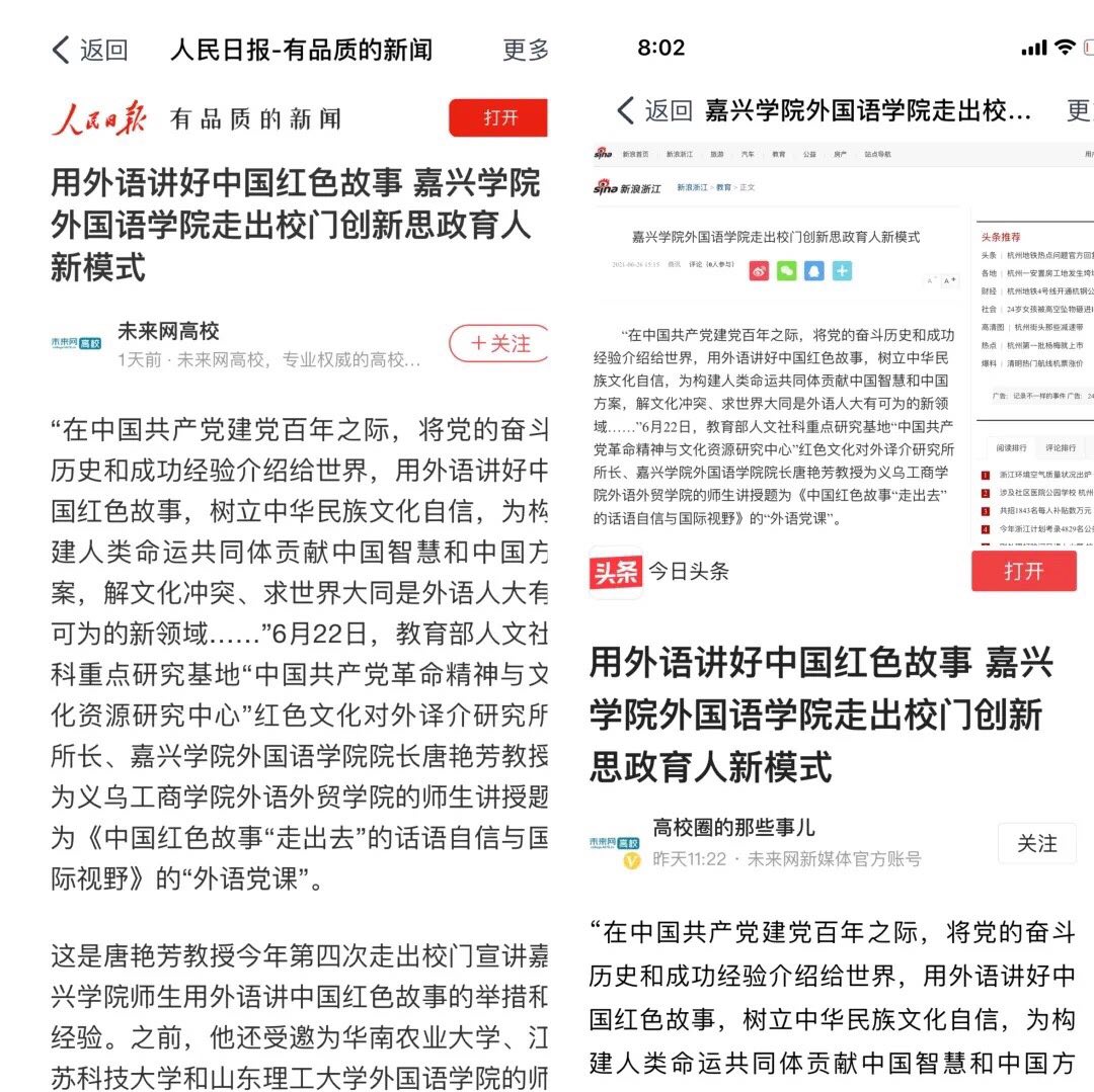 近日,我院唐艳芳院长从事的红色文化资源译介工作被《人民日报》新开元网页版客户端、新浪网、今日头条、读嘉、嘉兴电视台禾点点等多家开元网页版报道,红色文化资源译介工作的影响力和传播力进一步提升。