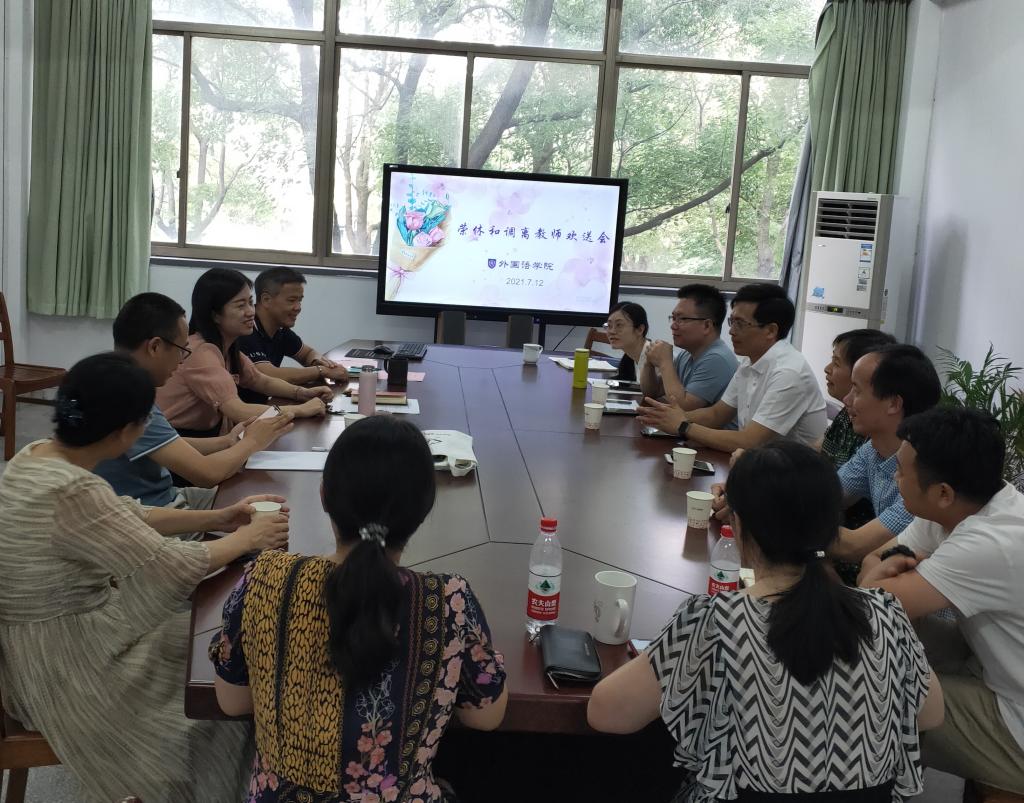 7月12日下午,外国语学院在外语楼204会议室为光荣退休的周振行、张文妮老师和调离外国语学院教师岗位的高万全老师举行欢送会。欢送会由学院党委书记周钰主持,荣休和调离教师、学院党政班子成员、行政四办主任和教师代表参加会议。