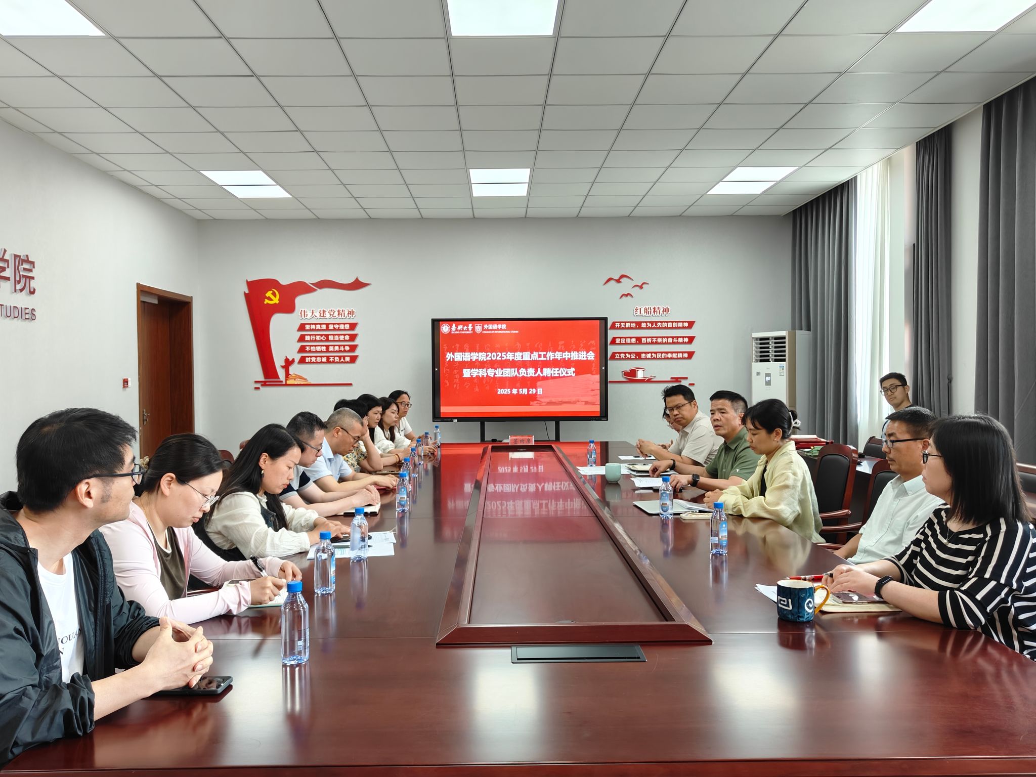 5月29日,外国语学院在兴德楼南楼516会议室举行2025年度重点工作年中推进会暨学科专业团队负责人聘任仪式。学院党政领导,翻译硕士学位点负责人,系部主任、副主任、教研室主任,外语培训中心主任,综合管理办公室主管、副主管,学工主管参加。会议由党委副书记张啸峰主持。