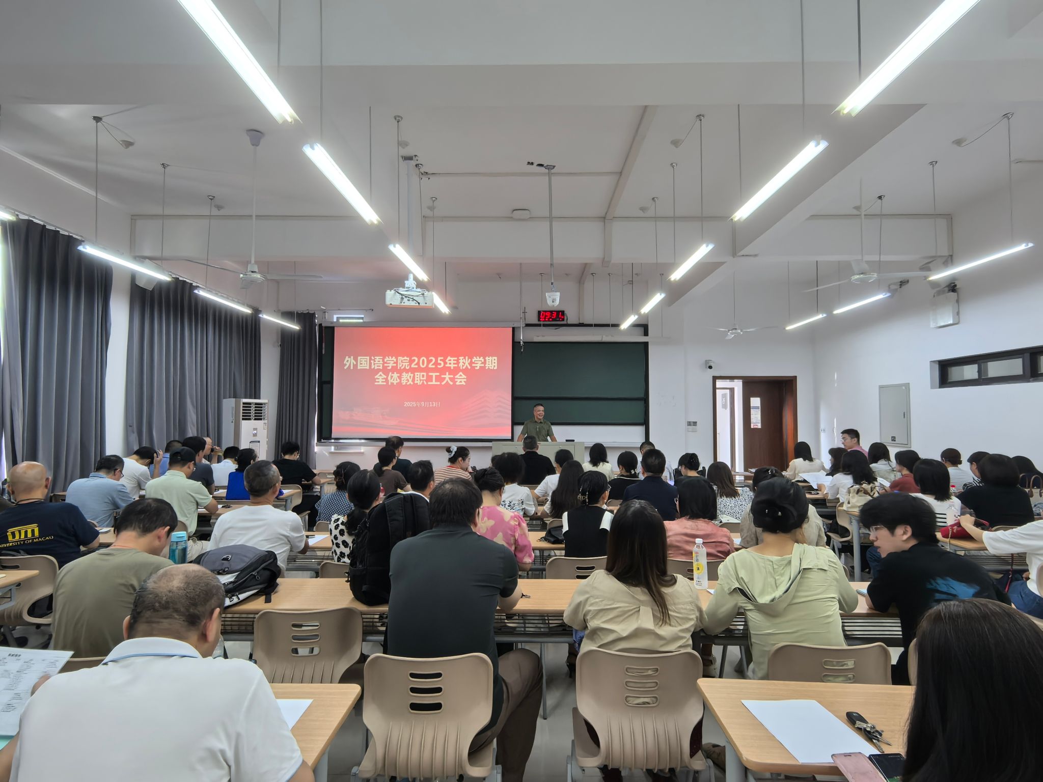 9月13日上午,外国语学院在兴德楼南楼205教室举行秋季学期全体教职工大会暨“教师开学第一课”。会议由院长唐艳芳主持,学院党政班子成员及全体教职工参加。